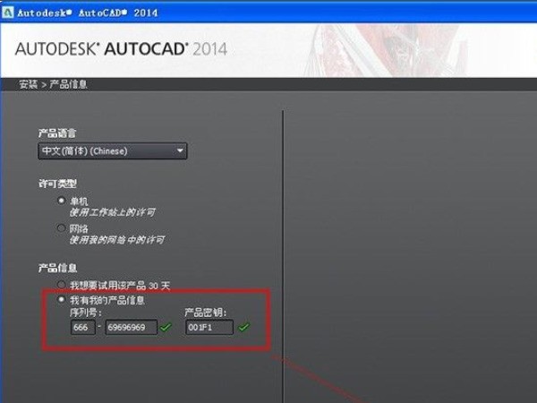 2、在序列号里填写666-69696969,产品密钥填写001F1。