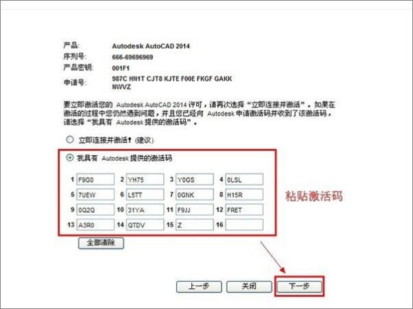 7、将生成的激活码复制到CAD的激活界面,并点击下一步。