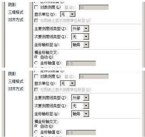 在打开的坐标轴格式对话框中,我们看到坐标轴的最大值最小值等都是自动的,我们为了自己设定,必须先选中固定的,然后设定数值,如图所示。
