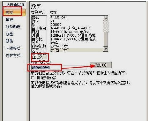 设置好刻度以后,我们点击数字选项,然后在类别下选择【自定义】,在各式代码这一栏输入 g/毫升 ,然后点击添加按钮。这个就是给数据添加一个单位的代码。点击关闭按钮