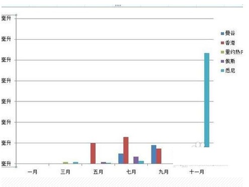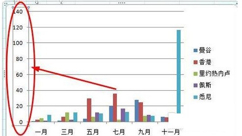 在插入的图表上,先点击纵坐标轴选中它,你可以看到这个坐标轴四周出现了四个小圆,也叫做控制点
