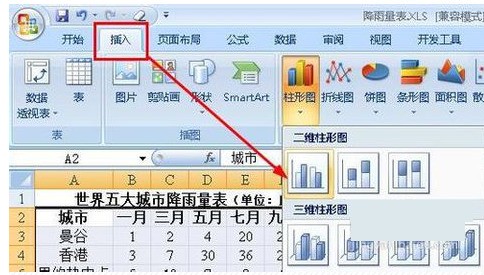 点击菜单栏上的:插入--柱形图,选择一种样式
