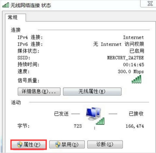 4.这个时候就会弹出“无线网络连接 状态窗口”,我们用鼠标左键单击“属性”(如下图):