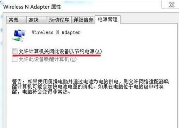 6.我们在弹出的“Wireless N Adapter ”属性窗口,单击“电源管理”,在弹出的新窗口中我们可以看到:允许计算机关闭此设备以节约电源前面打了勾(如下图):
