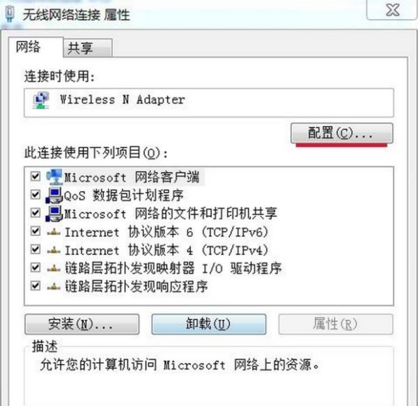 5.在弹出的“无线网络连接 属性窗口”我们用鼠标左键单击“配置”(如下图):