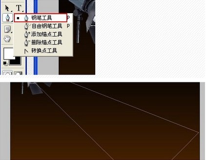 4.新建一图层,选择“工具栏”中的“钢笔工具”,在舞台绘制一个灯光投影路径形状。