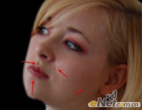 2.下百袁散块面观察女孩发现有一些瑕疵,我们来做一些修饰。如下图所示女孩的脸上有一些雀斑。