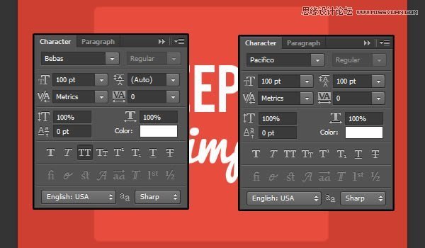 至于文本的第一行,使用的字体是Bebas,字体大小为100PT。而正在使用的字体创建的第二行太平洋,字体大小 100,领先的值设置为100为好。
