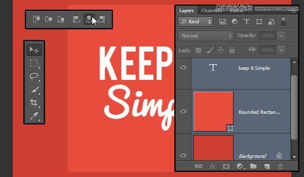 选择三个层次你有这么远,挑移动工具,然后单击对齐水平中心的图标选项栏,以确保所有的元素都正确居中的文档中。