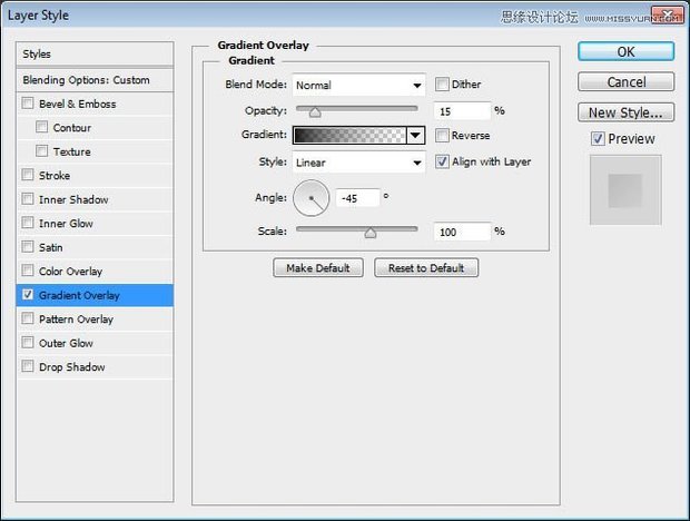 双击黑色矩形的图层应用一个渐变叠加效果。首先选择一个黑色到透明的渐变。然后,改变角度为-45,和不透明度为你喜欢的值,这取决于你想如何微妙或强烈的阴影是。这里所使用的值是一个相当细微1,这是15%。