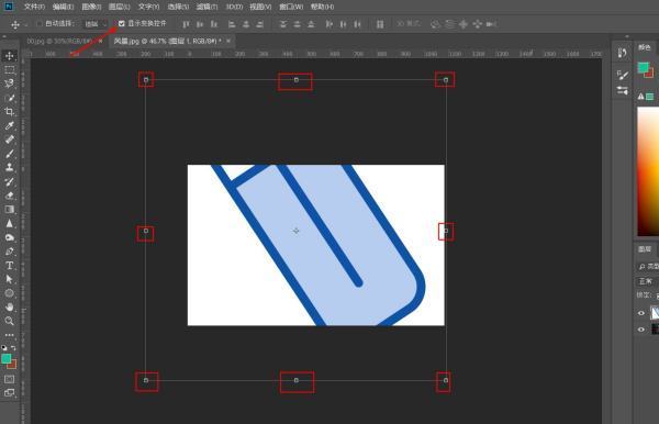 5、选中要调整图片的图层,点击箭头所示出的“显示变换控件”按钮,将按钮勾选,这时会发现图片四周出现了8个小点,可以通过这些小点进行自由变换操作。