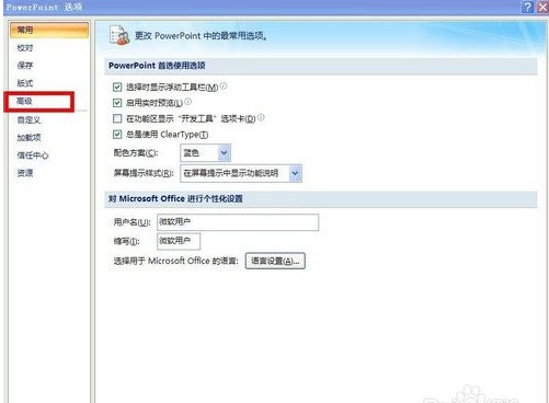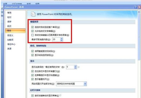 后按一下“PowerPoint 选项”,下面就大致类似了,切换到“高级”,在编辑选项这个小栏目下,更改即可。