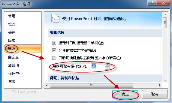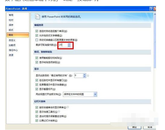 2、在“PowerP坏降采诉速oint 选项”窗口左侧按一将打孙沉交假下“高级”;从右边窗口找到“编辑选项”-“最多可取消操作数”。系统的默认值为20。我们可以通过修改这个数字,来自定义取消操作的次数。