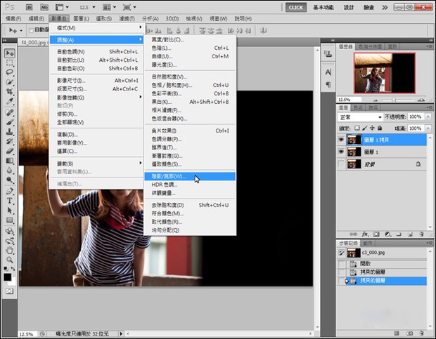 从主选单中选取【影像→调整→阴影/亮部】,开启【阴影/亮部】调整窗口。