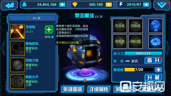 【英雄技能】 技能1:【浮游炮】(默认开启)释放两个球形浮游炮,自动攻击敌对目标,一定时间后收回。 技能2:【暗物质炮】(绿色开启)展开顶部的暗物质炮,发射一枚能量球,对范围内敌方目标造成能量伤害,并附加残废效果,降低其物理攻击强度。 技能3:【扭曲力场】(蓝色开启)启动超电磁引擎,扭曲空间力场,反射受到的物理伤害。 技能4:【暗影光环】(紫色开启)光环技能。操纵宇宙中的暗物质,降低所有敌方单位的能量防御。 【圣物技能】 5级 【普通攻击】额外令敌人进入灼烧状态。 10级【扭曲力场】额外反射受到的能量伤害。 15级【暗影光环】额外降低敌方物理暴击值。 20级【浮游炮】存续时间延长10秒。
