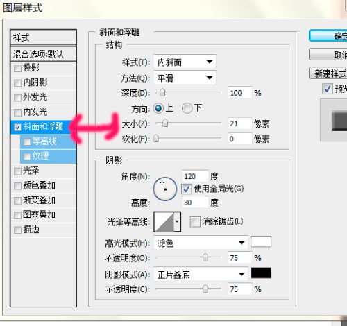 怎么样改变PS里的斜面浮雕里旁边预览的颜色