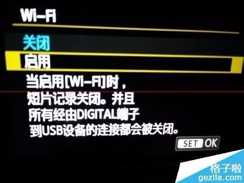 2、其次找到相机menu键按下,相机屏幕出现设置菜单,找到有WIFI设置的目录,点击WIFI 启用
