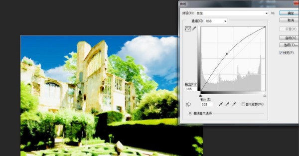 6.用完颜色就暗下来了,接下来用曲线或其他类似的工具调下颜色明暗。根据个人的画面需求调下