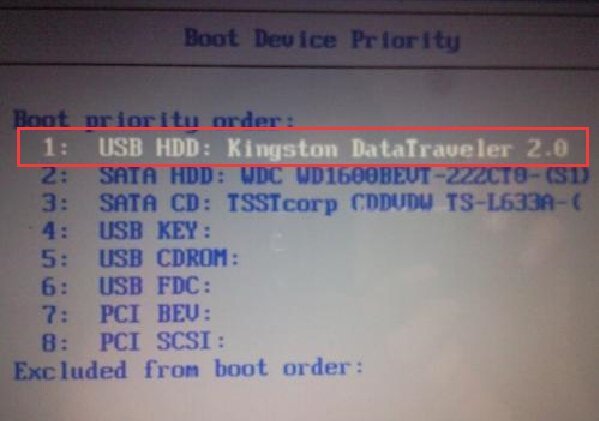 2、进入启动项选择窗口,选择USB驱动所在的选项(一般为USB HDD),按回车键确定进入,如图所示: