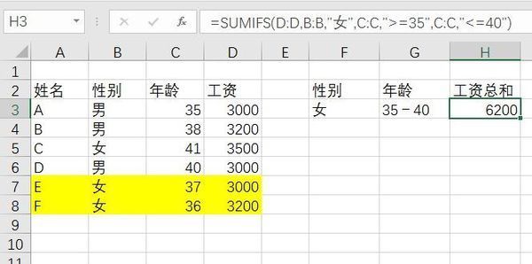 其中D3:E20代表要进行求和的数值范围;“>10000”代表第一个条件,表示员工每月工资超过1万元;“>0”代表第二个条件,表示员工每月出勤天数不少于0天。