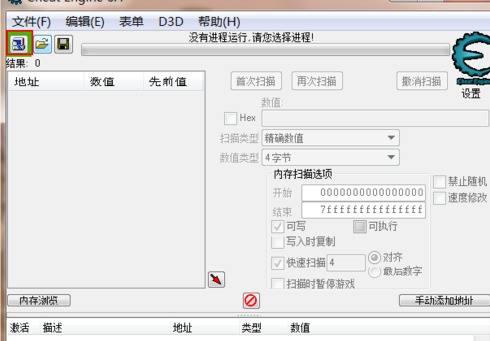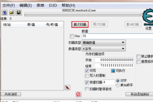 在红色框内输入当前金钱数,并单击“首次扫描”按钮。假设当前金钱数为10000,则输入10000并点击“再次扫描”。