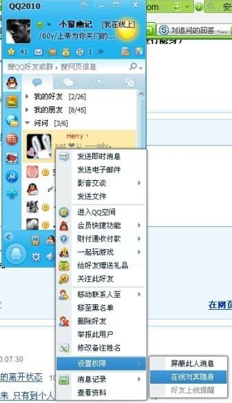 你QQ在线状态想对某个人进行隐身:右键点击那位好友-----“设置权限”----“在线对其隐身”搞定~