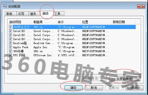 8. 打开系统配置画面后选择启动模块,选择右下角全部禁用,然后点击应用似河说条谁销,如果是苹果电脑注意要保留握背参速友里况程还苹果的启动项