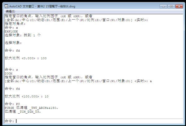 你的这个图形只有在AutoCAD2015版中才能正常编辑,确实很奇怪用pu命令清理只能清理掉很少的容量,清理结束时的文本界面如下图所示,显示有两个东西被清理了。