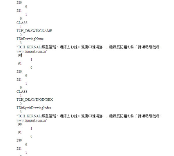 为了观察此图的内容,可以将其另存为.dxf文件,它的容量高达61.174MB,用WPS文字软件打开,随处可见网址的指示,可能它其中的图元都是引用的网上资源,文件中还有很多乱码(见下图所示)。时间一长,连这个在WPS打开的.dxf文件也出现提示:内存不足,文件已关闭。总之,这个文件很特殊。