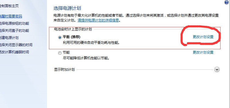 2.在控制面板中找到“电源选项”,点击进入,然后根据你的选择,我这边选择的是平衡,则在平衡的右边点击更改计划设置,自己是哪一项就选哪一项对应的更改计划设置,