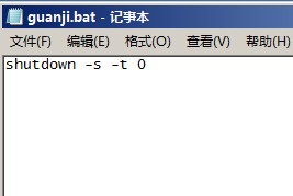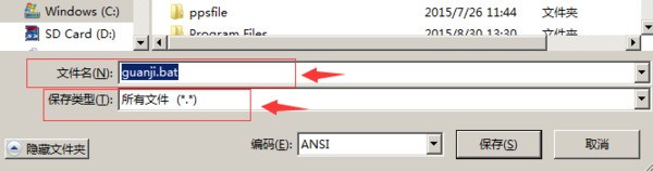 点“文件”菜单选“另存为”,在“文件名”栏里输入文件名为“guanji.bat”,文件类型 选“所有文件”(建议保存位置存在C盘根目录下),点“保存”;