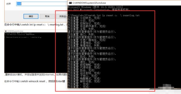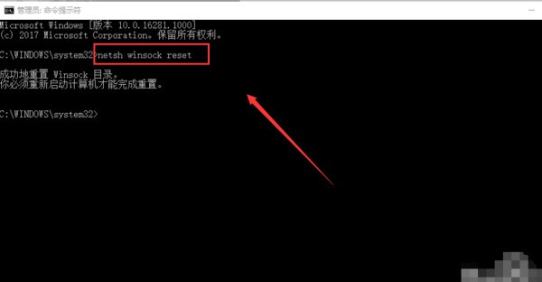4.在管理员命令行输入netshwinsockreset,然后按回车。