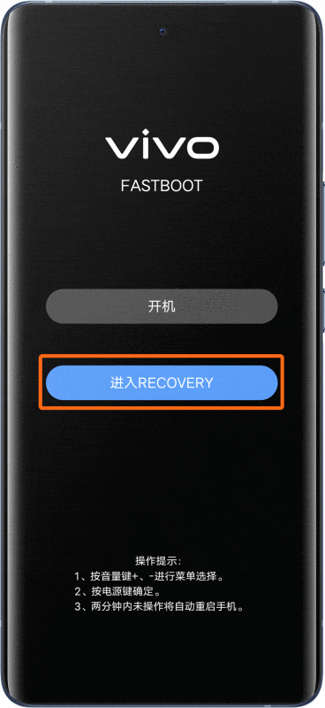 3、对于NEX 3/NEX 3S:在关机状态下,按住顶部圆键约1.5秒,然后再按住音量加键,进入FASTBOOT模式。使用音量键选择“进入RECOVERY”,然后按电源键确认进入。