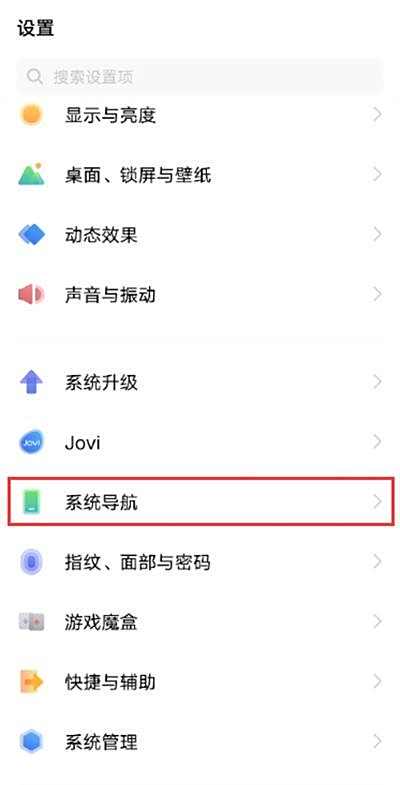 在设置菜单中,通过上下滑动屏幕找到“系统导航”选项。该选项可能位于“显示与亮度”“快捷与辅助”或直接列在主菜单中,具体路径因系统版本略有差异。