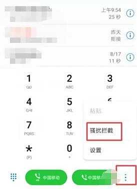 首先,我们需要打开手机,在手机界面中找到拨号图标,点击进入拨号界面。在拨号界面的右下角,我们可以看到三个小点的图标,点击它,然后在弹出的菜单中选择“骚扰拦截”。
