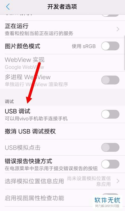 4. 然后在该界面中将USB调试选项右侧的开关打开,