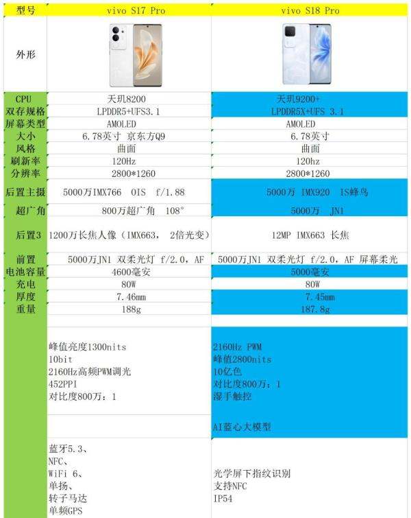 处理器:vivo S17 Pro搭载的是天玑8200处理器,而S18 Pro则升级为天玑9200+。后者在性能上领先两代,综合性能更强,适合对处理器性能有较高要求的用户。