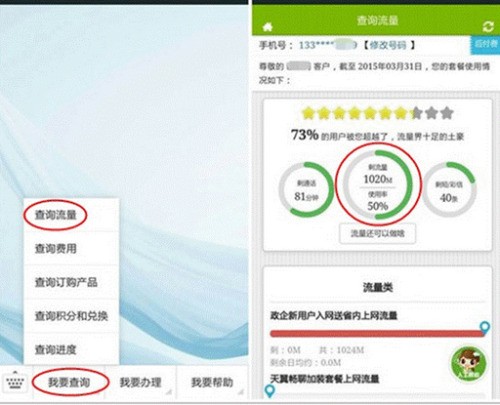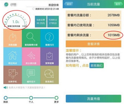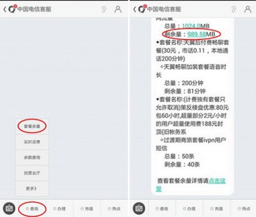 关注易信公众号“中国电信客服”后,点击“查询-套餐余量”进行查询。