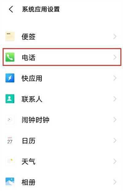 在“系统应用设置”列表中,点击“电话”选项。该选项专门用于管理通话行为,涵盖来电显示、通话界面、录音功能等设置。进入后,用户可对通话过程中的录音规则进行详细配置。