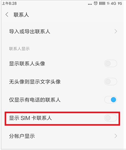 5、最后,完成上述步骤后,打开“显示SIM卡联系人”后面的开关即可,如下图所示。这样,问题就解决了。