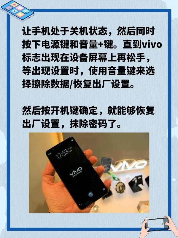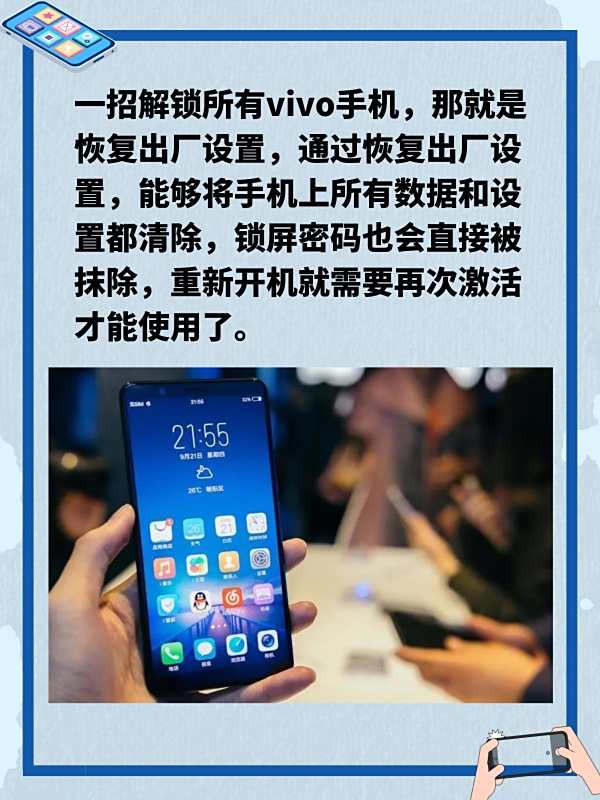 一招解锁所有vivo手机,那就是恢复出厂设置,通过恢复出厂设置,能够将手机上所有数据和设置都清除,锁屏密码也会直接被抹除,重新开机就需要再次激活才能使用了。