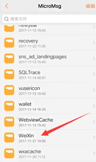 5.打开【MicroMsg】选项主界面之后,上滑选择界面上的【WeiXin】文件夹,如图所示。