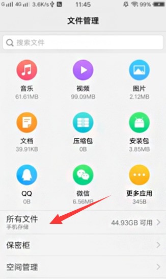 2.打开【文件管理】选项主界面之后,选择所有文件的手机存储选项并进入。