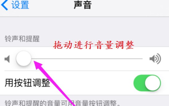 3、在声音的页面中会显示音量调整滑条,将滑条进行拖动即可对iPhone的音量大小进行调整。(滑条向右拖动为增大声音,向左拖动为减小声音)