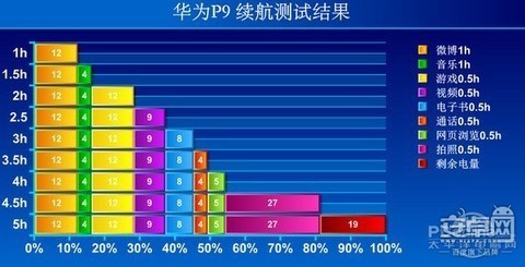 华为 P9在完成测试后剩余电量为19%,成绩良好,相信电量坚持使用一天不是问题。而从测试结果看得出,P9在拍照方面耗电十分明显,这不仅因为其使用了双摄像头,还因为其采用了一个独立的外置ISP 模块,所以会比较耗电。而P9 Plus的电池增大至3600mAh,相信续航性能会有一定的提高。