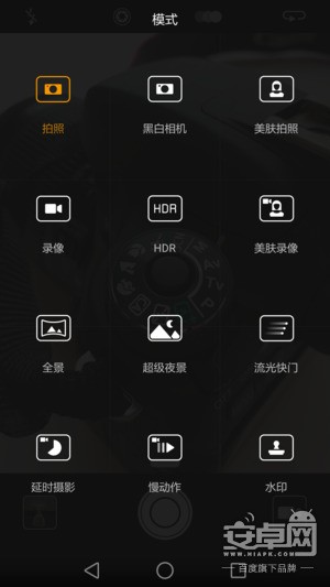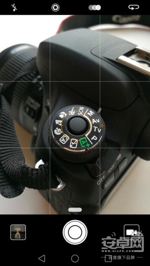 由于采用了全新的拍照系统,所以华为 P9相机的取景界面和早前的产品有着很大的差异,显得更加简约,而且更有格调。下方状态栏仅设有查看图片、快门以及视频拍摄的基础功能,而上方状态也仅设有闪光灯开关、大光圈模式切换、选择滤镜和切换前置或后置相机的按键。