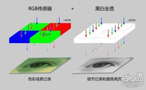华为P9后置的两颗摄像头分别采用了索尼 IMX286彩色传感器和Monochrome黑白传感器,其中RGB彩色传感器主要用于色彩的记录,而Monochrome传感器则负责分析光线,记录画面细节以及提高画面亮度。由于黑白传感器属于全透光的传感器,所以有着更大的进光量,官方称的同样环境下是iPhone 6s进光量的270%,能提升弱光环境下的成像素质。简单来说,黑白传感器能提高弱光环境下面的成像质量,捕捉更多的细节。