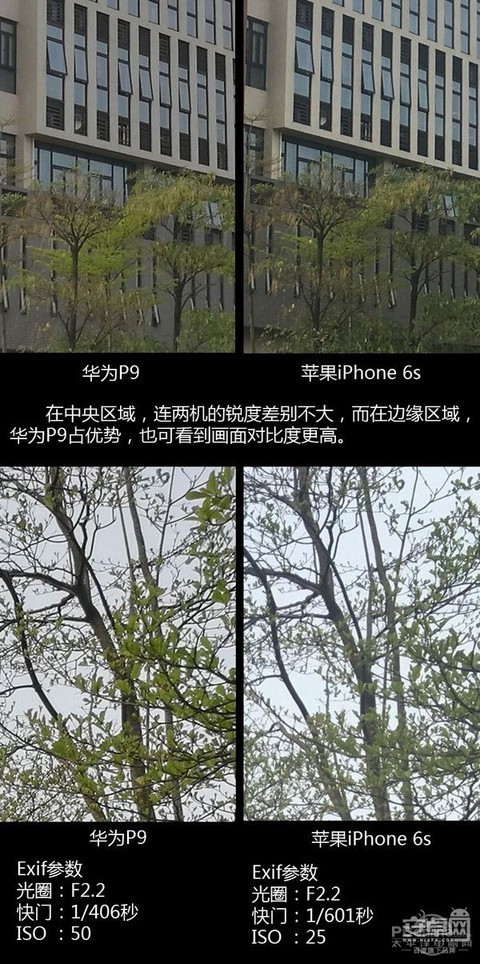 在色彩表现上面我们看到,华为 P9要更为鲜艳一些,且画面拥有更高的锐度,而苹果iPhone 6s会给人一种朦胧的感觉。