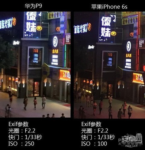 在夜间样张放大对比当中可以看到,因为两机都不支持光学防抖,选用了较为保守的1/33秒安全快门,不过iPhone 6s的调教要保守一些,只选用了ISO100,画面保留的色彩信 息较少显得暗淡无味,而华为P9的色彩表现会更好,且虽然P9选用的ISO 要高一些,但是画面纯净度与iPhone 6s差别不大,让人满意。
