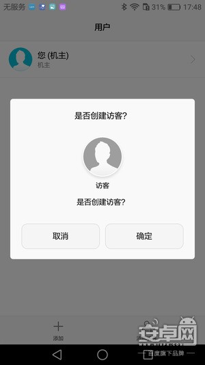 具体的功能上,EMUI 4.0中取消的访客模式在EMUI 4.1中回归了。尽管这是个不大不小的改进,但对于一部分用户而言,这却是一个很大的惊喜。和EMUI 3.5不同,这个功能被放到了一级设置菜单上,并将名称改为了“用户”,点击该选项可创建新的访客。